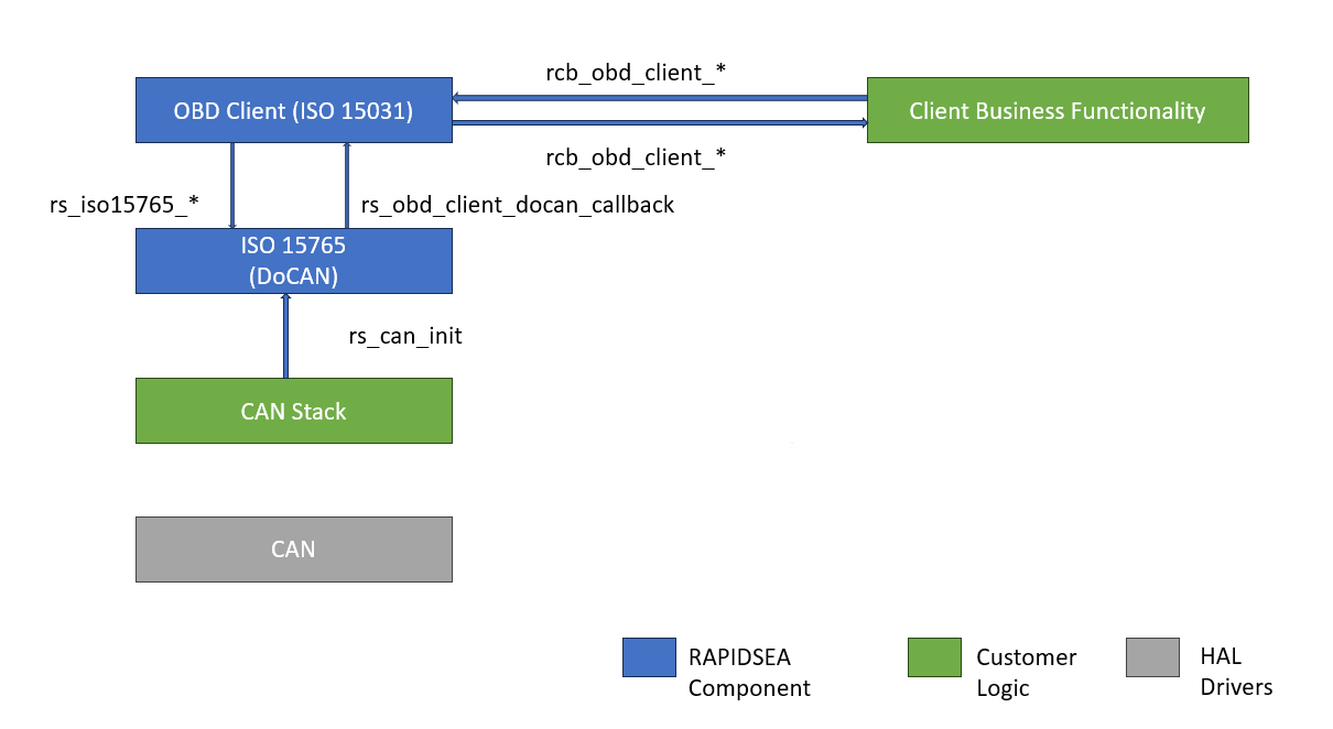 The OBD-II client communicates over the CAN network through the underlying DoCAN stack (ISO15765). This DoCAN stack is also available as part of the RAPIDSEA components. All the functions that are needed are available as part of the DoCAN stack and has to be compiled together.