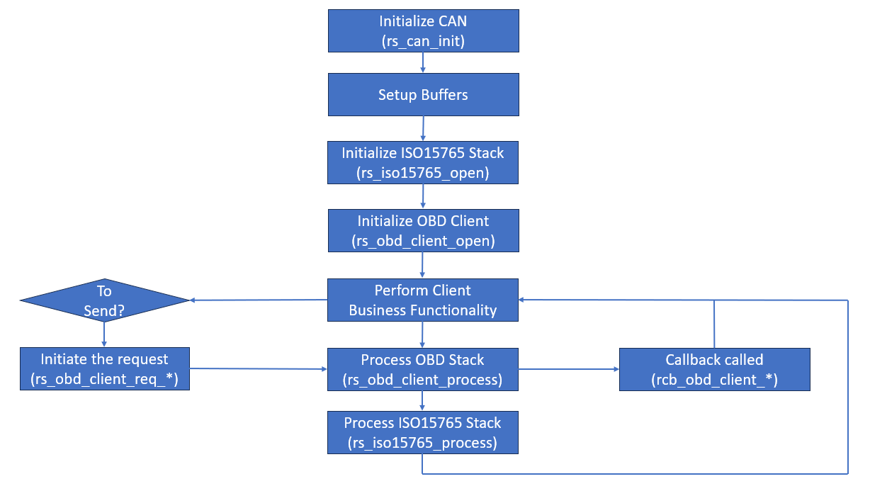 While the RAPIDSEA OBD-II client stack can handle most of the functionality such as message validation, session management, timing control etc, the business logic has to implement the application functionality. The RAPIDSEA OBD-II client clearly defines API and callback functions that are essential for the user to use/implement.